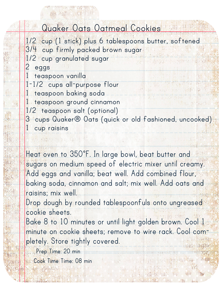 “Where did I get the recipe?” I heard someone ask.  Well, I am a huge fan of recipes coming from “the back of the box” or bag or some other part of the package.  I believe that these food companies spend lots of money perfecting their “Back of the box” recipes so that you will buy their particular product. Plus, why reinvent a perfectly good cookie recipe?  This little gem was hidden under the top of the Quaker Oats Box.  It was called “Vanishing Oatmeal Cookies”.  Here is the recipe: