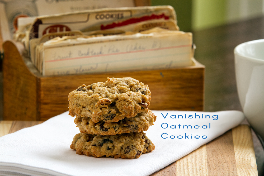 Now I know why they call the cookies “Vanishing Oatmeal Cookies”.  They are tender, chewy and not too sweet.  But keep them wrapped up otherwise they get stale pretty quickly.