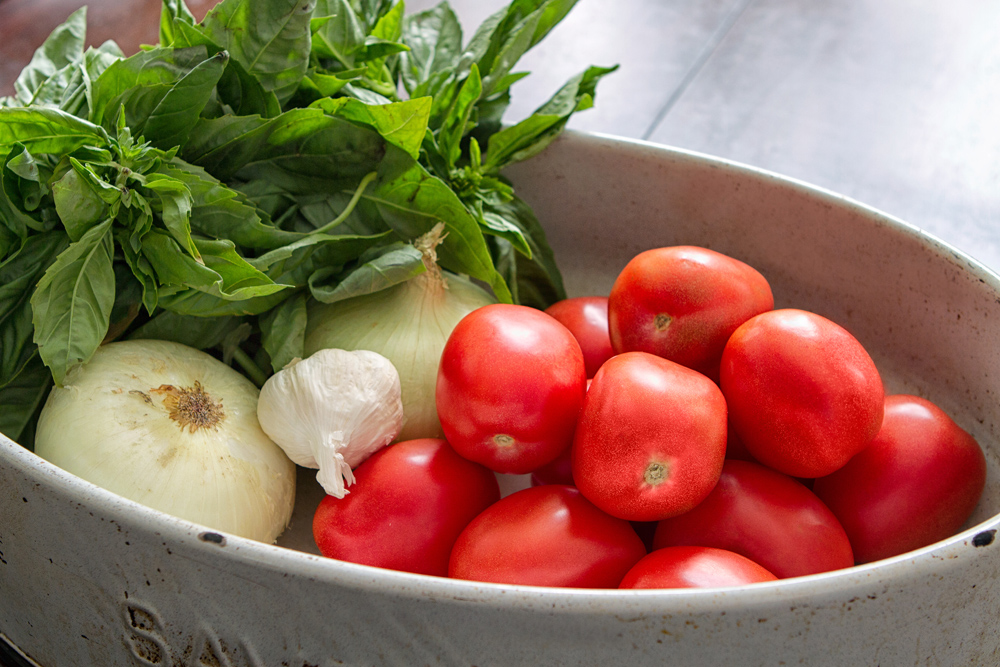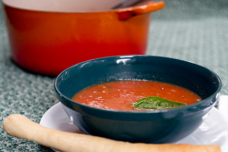 I must admit that I did not watch every step that Yes! Chef! did because I was editing some photos from a recent photo shoot.  But I did hear him rustling around and I yelled in “Now what are you doing” every once in a while. So, because of that, I missed a shot of the nicely roasted tomatoes.  He dumped them unceremoniously into the soup without letting me know.  Gack!  I need to start watching him like a hawk.