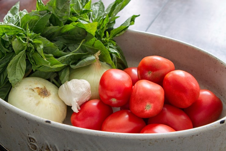 I found this great recipe from Ina Garten at Food Network which seemed to be very easy and tasty.   I ran into a friend while I was in the produce section and the next thing I knew there were bunches of basil, fresh and ripe plum tomatoes, onions, garlic and chicken stock.  I had no idea I had an app for that.