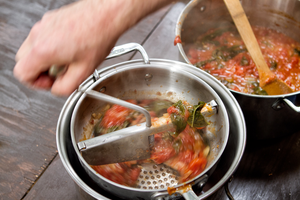 The ingredients were poured into the Ricer and then the handle was turned to squeeze the chunks down into the soup.