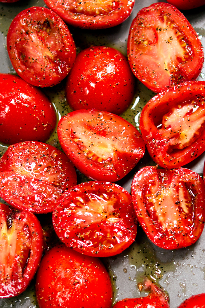 First he cut the Roma Plum Tomatoes in half and tossed them with oil, salt and pepper.