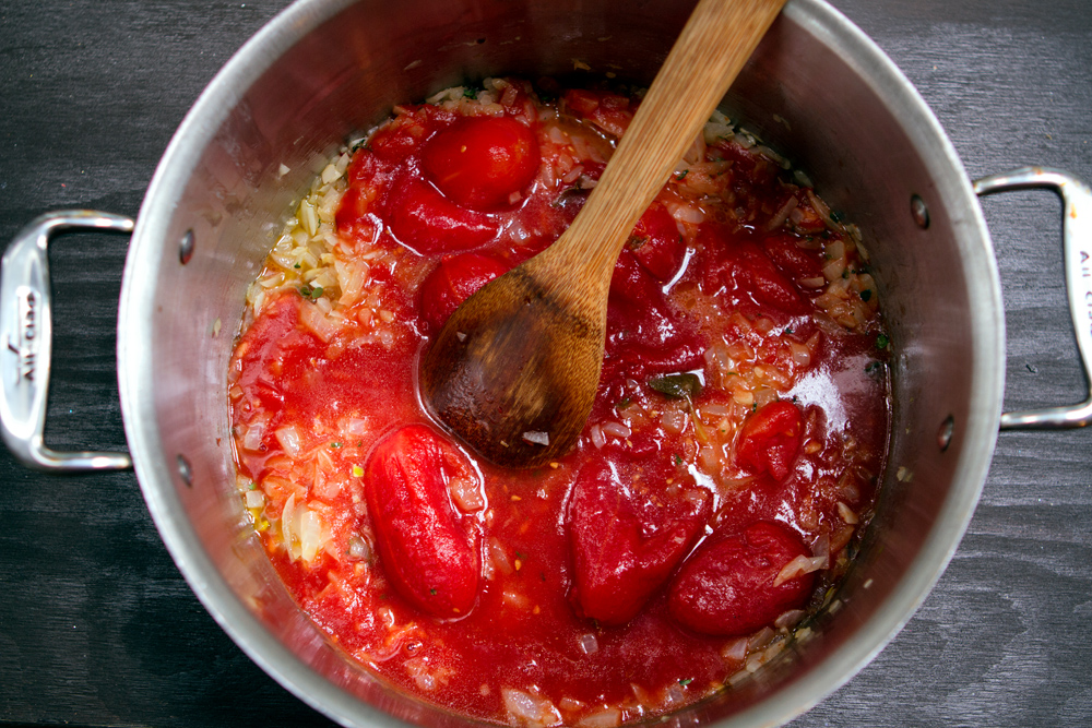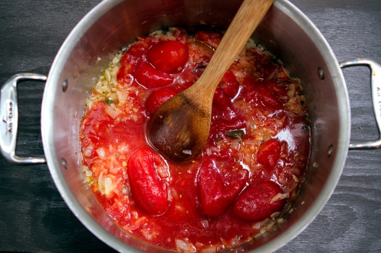 He sauteed them in the pan with oil and butter and added the can of tomatoes.  (As an aside, he was curious why the recipe called for both fresh and canned tomatoes.  I, of course, had a ready answer…I shrugged and suggested he ask Ina.)
