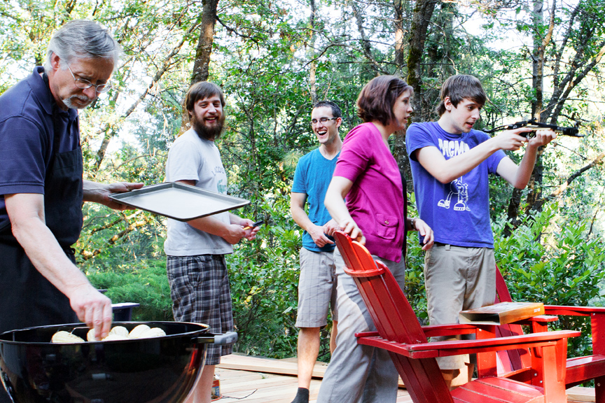 The trouble started when I put it in the ice cream freezer…I think.  It churned around happily for a while and then when I checked it after about 20 minutes, the texture was a little grainy.  Oh well, I foolishly thought, it will get better after I stir in the cookie dough and put it in the freezer to freeze.  Famous last words.  After all the cross-bowing, and shooting out lights and barbecuing with Yes!Chef!’s new Weber and eating of the good food prepared by Yes!Chef! and other merriment, I broke out the Cookie Dough Ice Cream that everyone was eagerly waiting for.  (Hangs her head in shame.)  It was a disaster.  The cookie dough tasted fine, although I think it had too many chocolate chips and not enough dough.  The texture and mouth feel of the ice cream was, to say the least, not good.