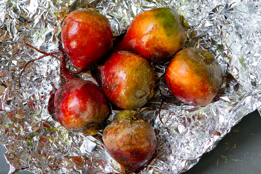 Put a large piece of aluminum foil on a baking sheet and put the beets on it. Drizzle olive oil over them and wrap them tightly in the foil, making a packet. Roast until a knife inserted into the largest beet meets no resistance, about 1 hour to 1 hour and 15 minutes. Cool and remove the skins by rubbing the beets with a paper towel.