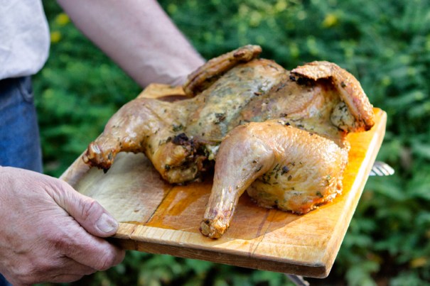 Yes!Chef! roasting chicken in his new barbecue