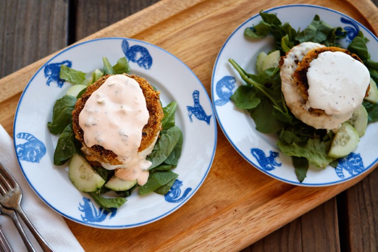 Here, I will insert a little editorial taste note. Both sauces have mayo as a base which makes them very rich sauces. They were also a little thick for my taste. I wanted to make the base with Greek Yogurt and add a little mayo, but Yes!Chef! said we should try it according to the recipe the first time we make it and then we can experiment from there. I think that is a good idea, in general, because then you know what the sauce is supposed to taste like. We both thought the sauces were delicious, bold and spicy, but they were just too rich for us paired with the fried tomatoes. Later, we mixed in some Greek Yogurt, which made the sauces thinner, but of course the flavor was diluted. We both agreed that next time we would use more Greek Yogurt (a healthier choice, anyway) and maybe just a touch of mayo.