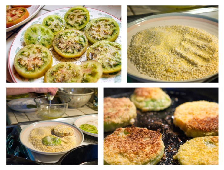 This is a relatively easy recipe to make, however, it is messy. Yes!Chef! cut the tomatoes into roughly 1/2″ slices and laid them out on plates. He then mixed together the dry ingredients. (Economy note: Don’t bother trying to find self-rising cornmeal that you will probably never use again. To make 1 cup self-rising cornmeal, take 3/4 cup cornmeal plus 3 tablespoons, mix in 1 tablespoon baking powder and 1 teaspoon salt. That’s it!)