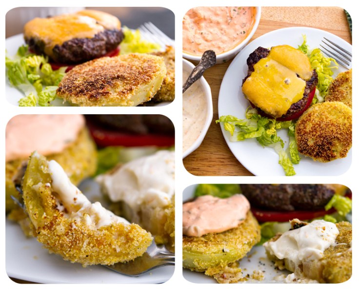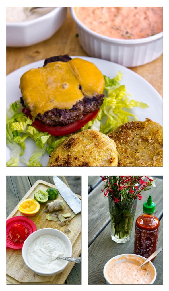 Everything sounds so delicious, I will try the sauces (maybe 1/2 mayo, 1/2 yogurt) and making your own burger blend – how creative. Love, love fried green tomatoes. You new photo set up with 4 to a post is very appealing to the eye. Is that a new template on wordpress?