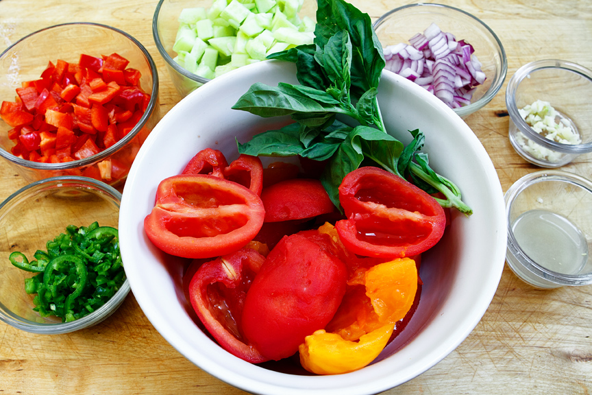 All this to say that I am not used to doing a lot of preparation anymore.  Y!C! loves the prep work.  He is extremely respectful of the food that he is making.  He takes his time with cutting and chopping making sure that he is not hacking and whacking (which I have been known to do.)  So, taking my cue from him, I took my time with the prep work for this gazpacho.  And it took a looooong time…at least it seemed to me. I made sure everything was prepped and ready to go before I started making the soup.
