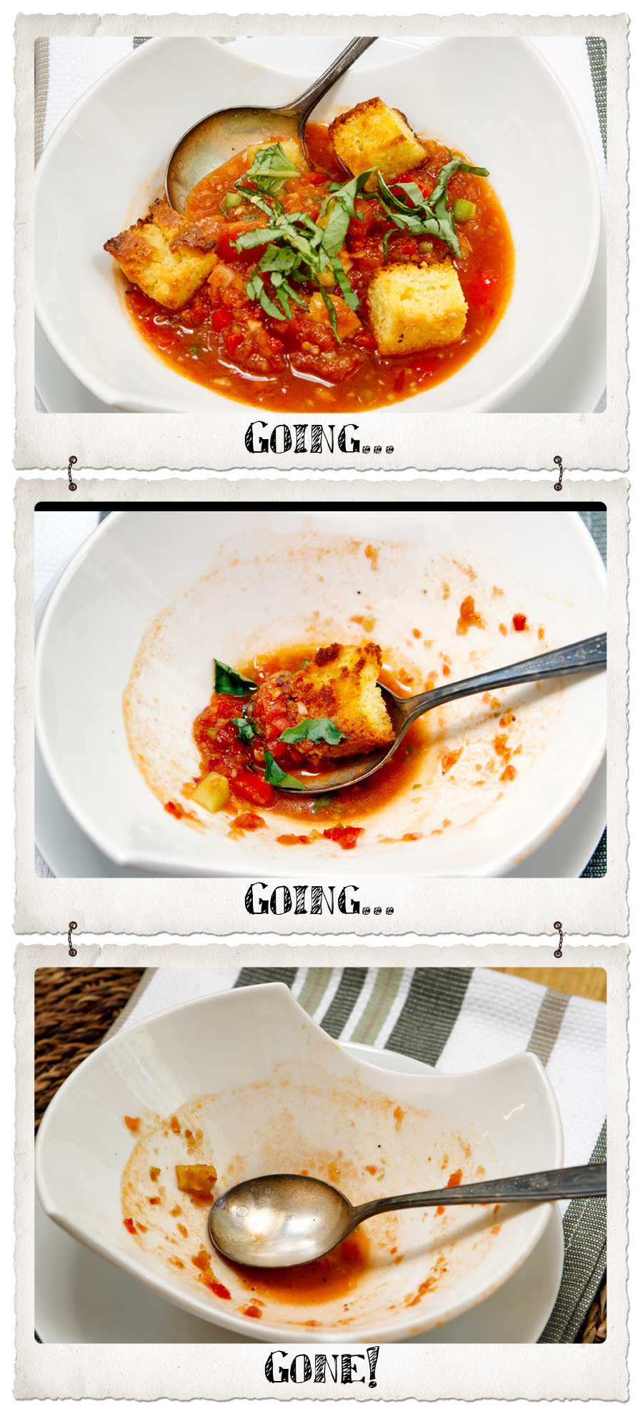 1. Thank you. We finished up the soup and the croutons today. spicy, fresh, sweet, salty and herbaceous. Love gazpacho on a hot day and today is a warm one here in the Sierras.