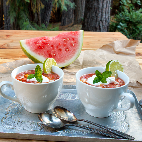 Well, today is National Watermelon Day. What a coincidence that I happened to make Watermelon Gazpacho yesterday and it is perfectly chilled and ready to eat tonight. It’s quite warm here in the Sierras, so maybe it will help cool us off.