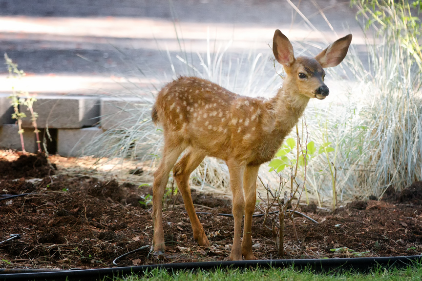 These two tiny deer showed up yesterday with mama deer. She was probably teaching them the food circuit in my neighborhood. It looks like I do not have much growing in this planter. However, if you look closely, you will see that most of the plants have been denuded. So, I have a lovely stem garden.
