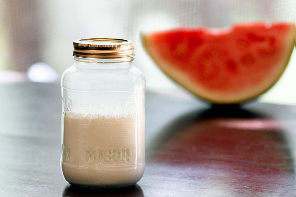 Mix together 2 cups heavy cream with 2 tablespoons cultured buttermilk in a non-reactive container. I used a mason jar that I had on hand. Cover it and leave it alone on your counter for about 12 hours. Don’t worry about it spoiling on the countertop…that’s what it’s supposed to do. After it comes to the desired consistency, put it in the fridge because it’s done. The texture is smooth and creamy. It dollops quite nicely on top of your Watermelon Gazpacho.