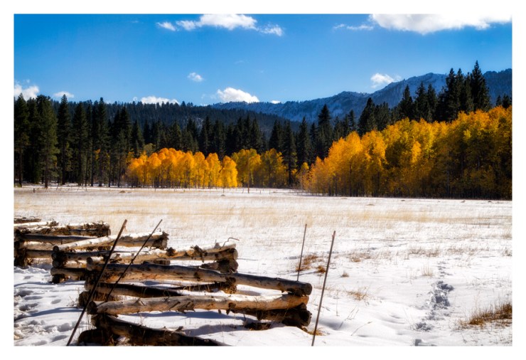 Although, I would prefer not to be snowed in, it was quite beautiful to be in Tahoe during this storm because the fall leaves were still visible on the Quaking Aspens. I drove around a little after my friends had left and took some pictures.