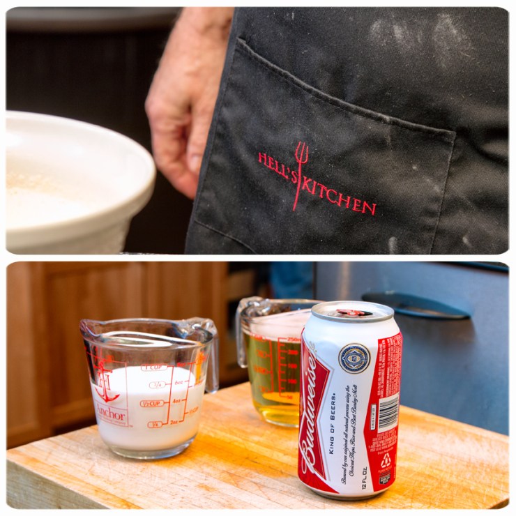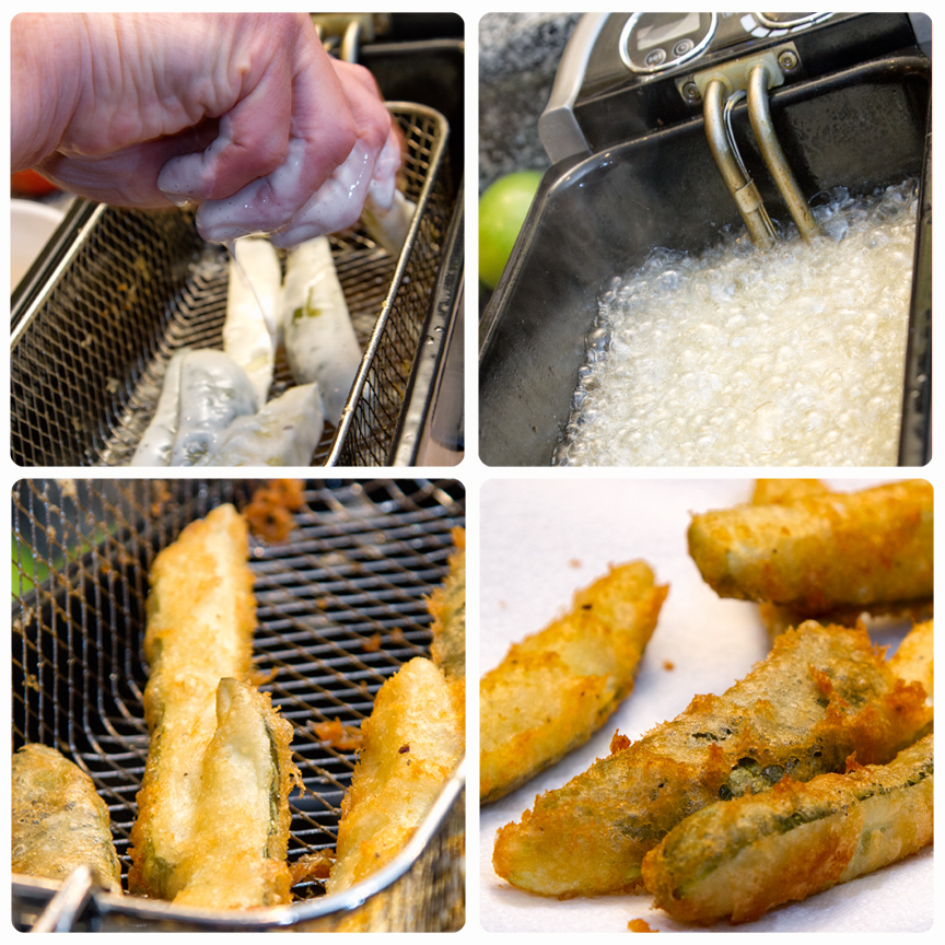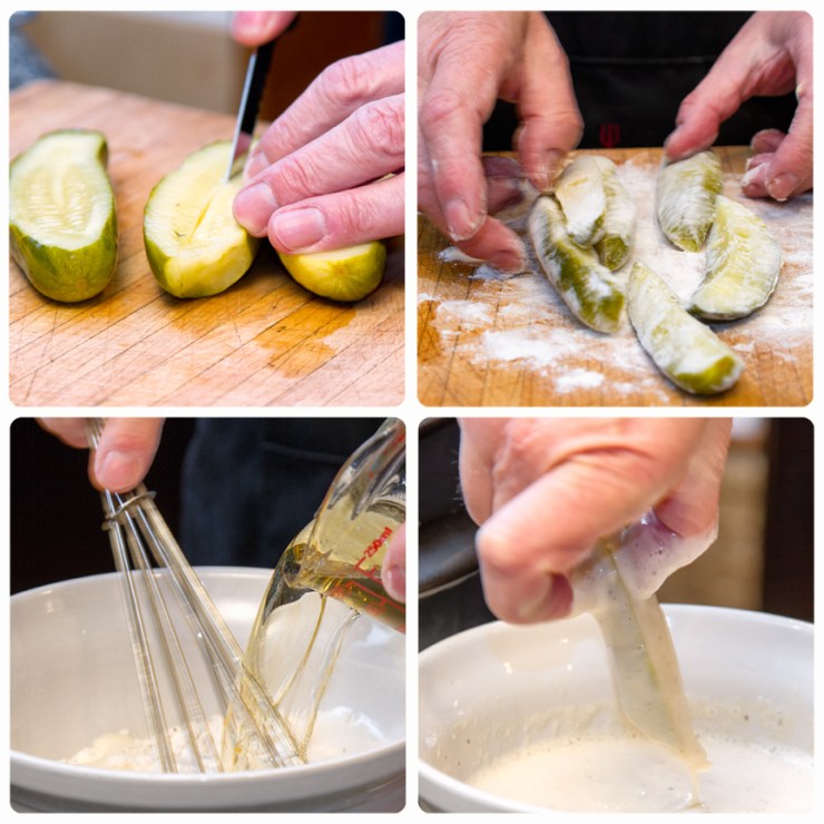 Yes!Chef! patted the pickles dry and then tossed them around with flour. Then he made up the beer batter and dipped the pickles in the batter.