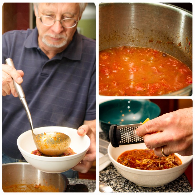 Above, Y!C! dishes out the finished chili and grates some cheese over the top.