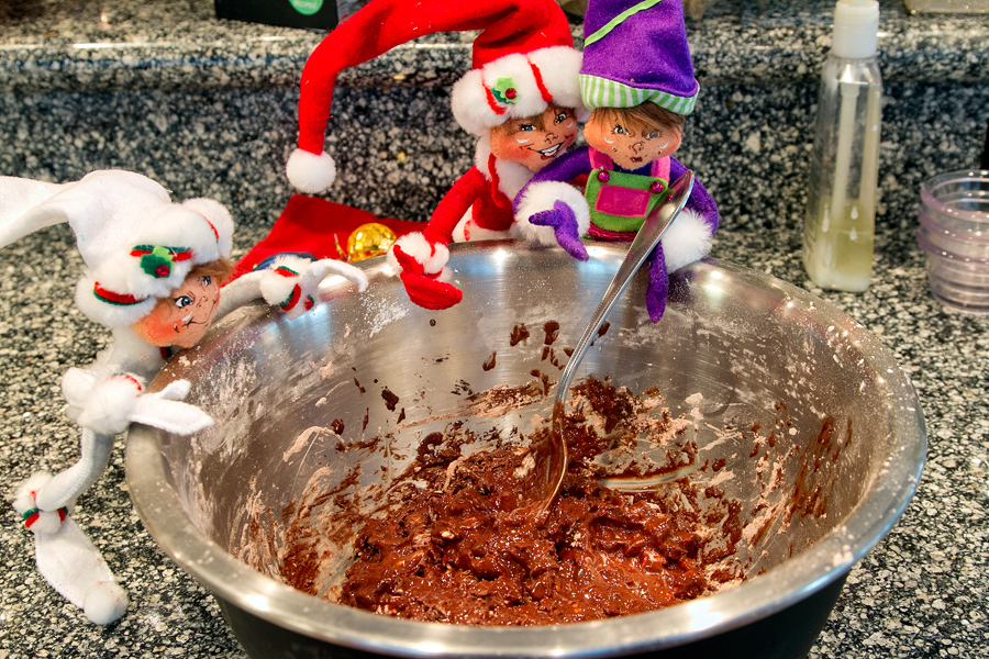 After toasting the nuts and sifting the sugar, we (and I use that word liberally) began mixing the ingredients together. It was then I noticed the new elf. But, I didn’t act surprised that a new elf would join the pack because they seem to come from everywhere (Edmond has a gift of hospitality that I wish I had.)