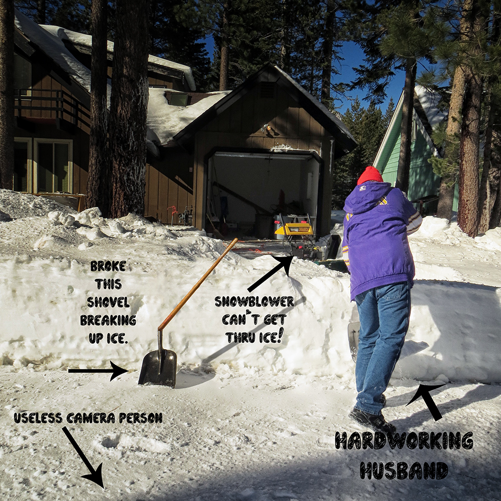 We decided to go to Tahoe for the weekend and since we hadn’t been here since early November, there was a little bit of snow-blowing to be done so we could get in to the durn place.  I went out to help Yes!Chef! shoveling some of the snow, which was ice encrusted, so that the blower could get thru the four feet of snow in front of our little slice of heaven.