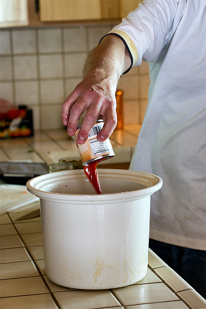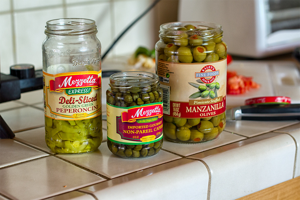 My favorite part is the relish that goes in the pot.  It is comprised of Pepperoncini, capers and Manzanilla olives.  This adds a great acid flavor to the dish. Chop it up and throw it in the pot with a little of the brine. Then add all the spices and the tomato sauce and the water.