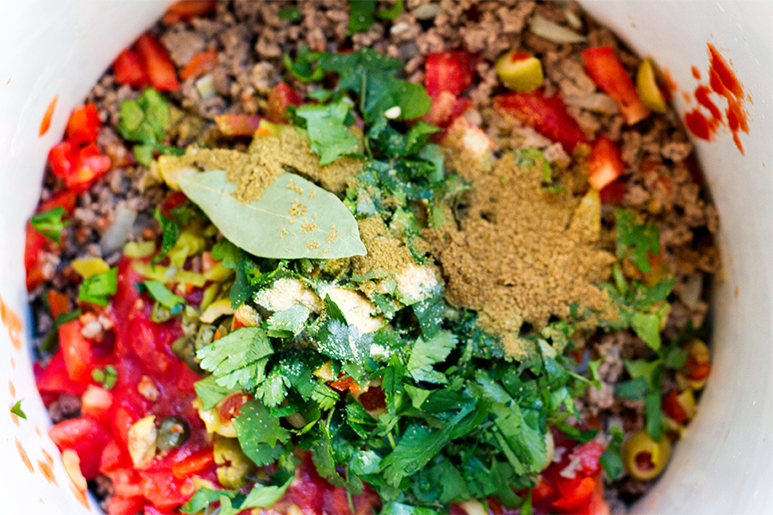 3.  Transfer the meat to the Crock Pot.  Add the chopped tomato, cilantro, tomato sauce, 1 1/4 cups water, olives, capers and pepperoncini. You may also add a little brine from the olives or pepperoncini for additional flavor.  Add the spices.  Stir everything around so they can all get to know each other.