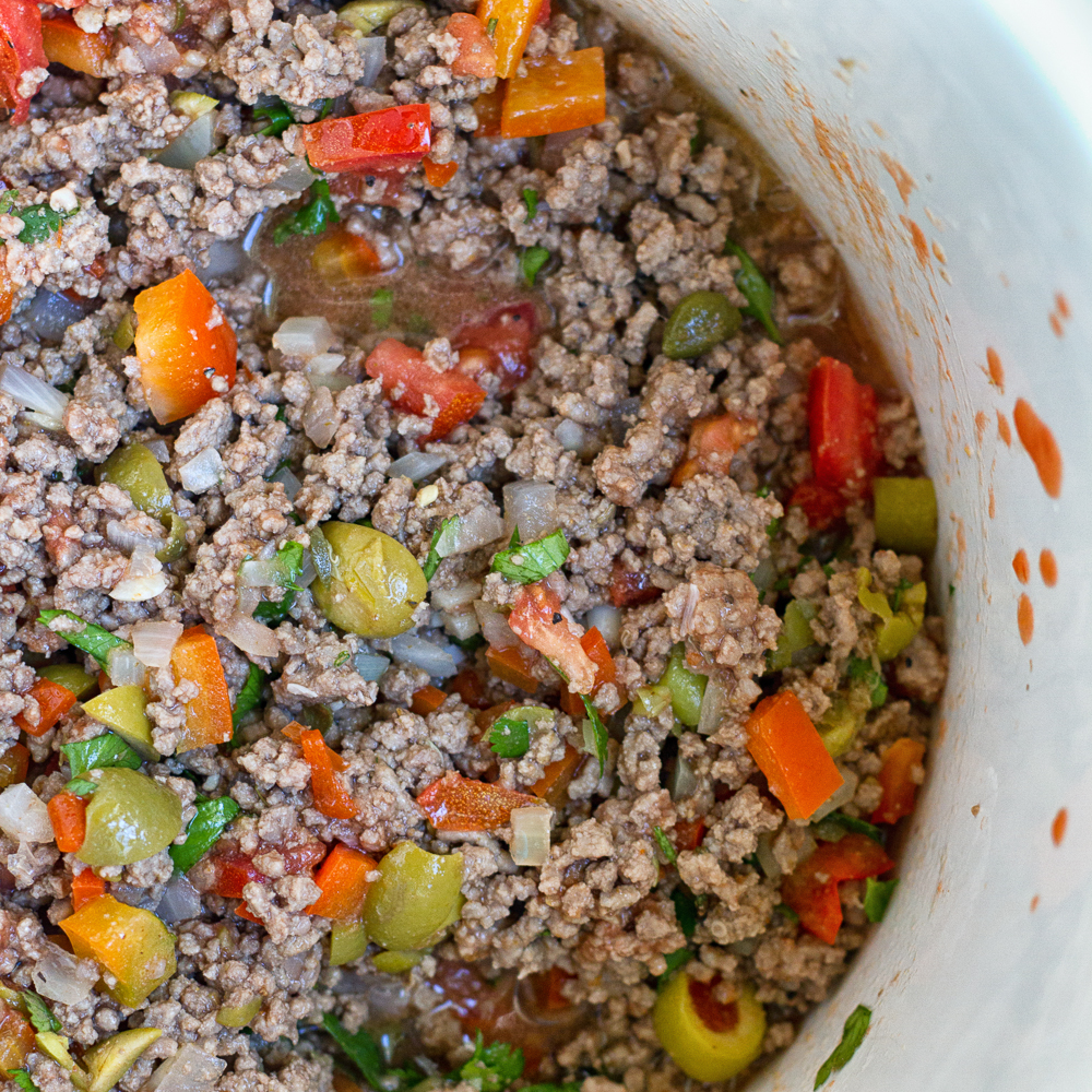 Picadillo:  ( “mince”) is a traditional dish in many Latin American countries and the Philippines (where it is known as giniling, and also Arroz a la Cubana) that is similar to hash. It is made with ground beef, tomatoes (tomato sauce may be used as a substitute), and other ingredients that vary by region. It is often served with rice or used as a filling in dishes such as tacos, savoury pastries or croquettes. The name comes from the Spanish word “picar,” which means “to mince” or “to chop”.