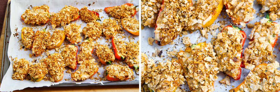 6.  Dip stuffed mini peppers into crushed tortilla chip mixture and place back onto baking sheet.