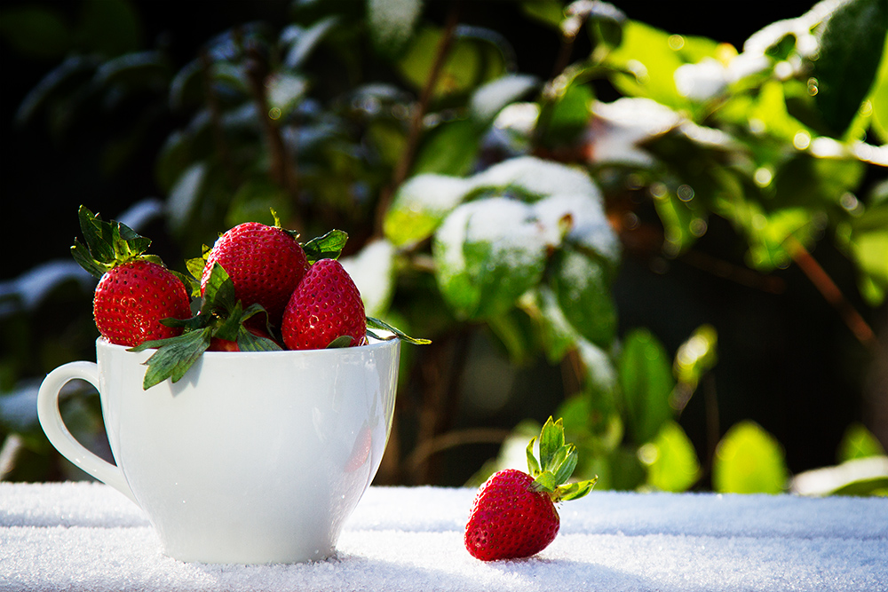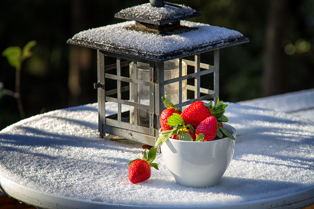 My best friend, who grew up in Maine, says that she used to eat strawberries and snow when she was growing up.  I credit her for inspiring these photos.