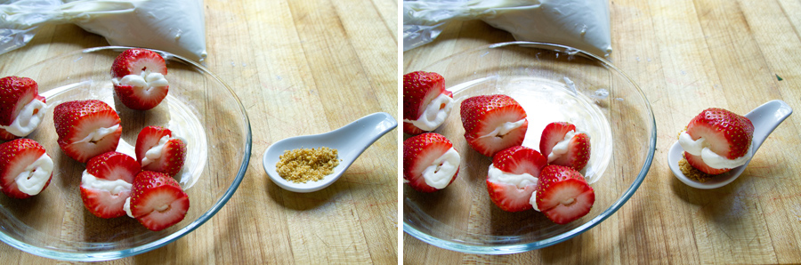 He also suggested that I cut the strawberries into several (3-4) layers and then pipe cheesecake onto each layer…like tiny little strawberry shaped layer cakes. I considered that suggestion for a few seconds and then pronounced him a little crazy if he thought I was going to do that.  Right?