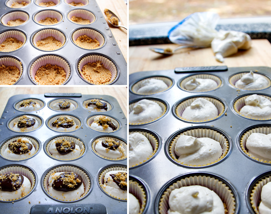 Then I cut a little bigger hole in my bag full of cheesecake filling and piped some of the filling on top of the crust.  Next came a dollop or two of the ganache and I finished it off with more crumbs.