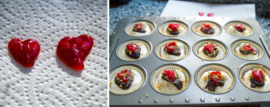 I had to practice a little before piping the gel on to the cheesecake cupcakes.  My practice hearts came out pretty good.  The ones on the real cupcakes…not so much.  But, it does say Valentine’s Day.  If you don’t have sparkle gel (which I do not know why you would not…) you might want to use those little candy hearts with the pithy sayings on them like, “Say Yes”, or “I Love You”, or “Lets Kiss”.  My men won’t care that the hearts are not perfect.  They will get the message that I love them.