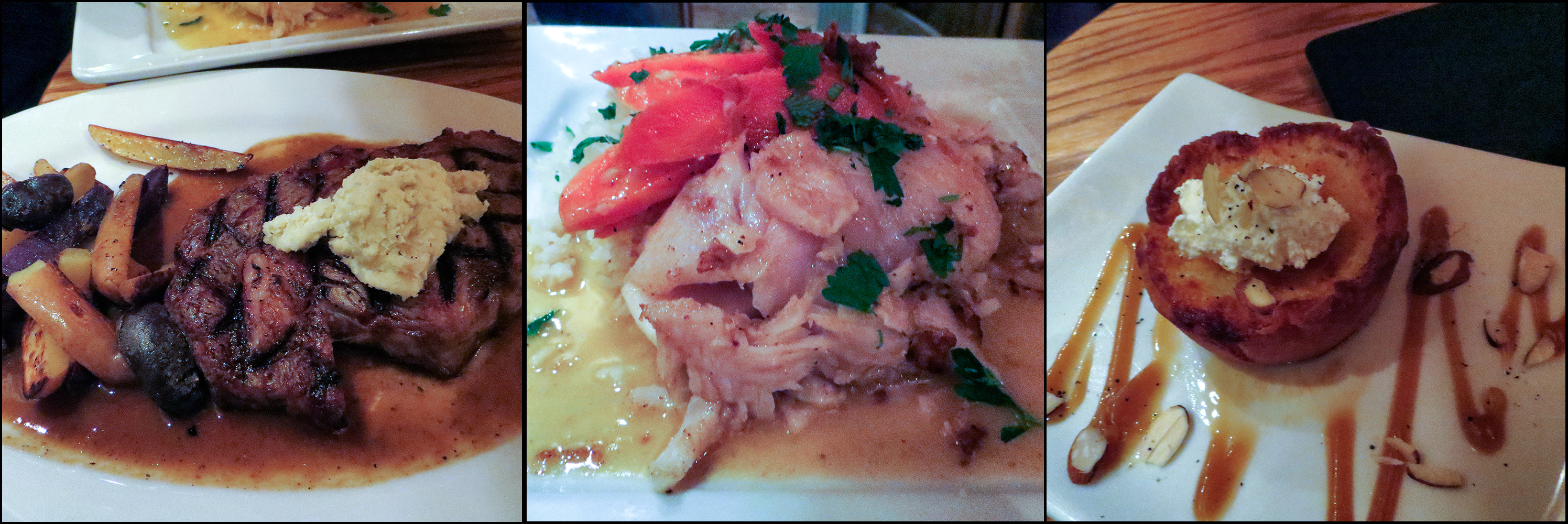 This was taken at a local restaurant (who’s name shall remain a mystery to protect their good reputation from my horrible pictures.)  This was a lovely meal that Yes!Chef! and I both enjoyed.  I had a great steak with herb butter and roasted fingerling potatoes.  Yes!Chef! had seafood stuffed halibut with a Ginger Sauce and Rice.  We shared a lovely tart.  The food tasted great.  The only light available was overhead lighting and the flash on my camera (which I did not use because it would have disturbed the other diners.)  These pictures do not in any way do the food justice.  The color is odd.  There are bizarre shadows from the overhanging light and the photos are blurry because of the low light and camera shake.  The question is:  How could I have improved these photos?  I was able to remove some of the yellowish cast caused by the tungsten lighting post processing, but there wasn’t much else I could do short of bringing in an off camera light or taking the food outside, which would have ruined the experience and disturbed the other patrons.  There were no windows in this restaurant, but if there were, I could have photographed the food next to the window.  Window light is highly desireable for better food photography.