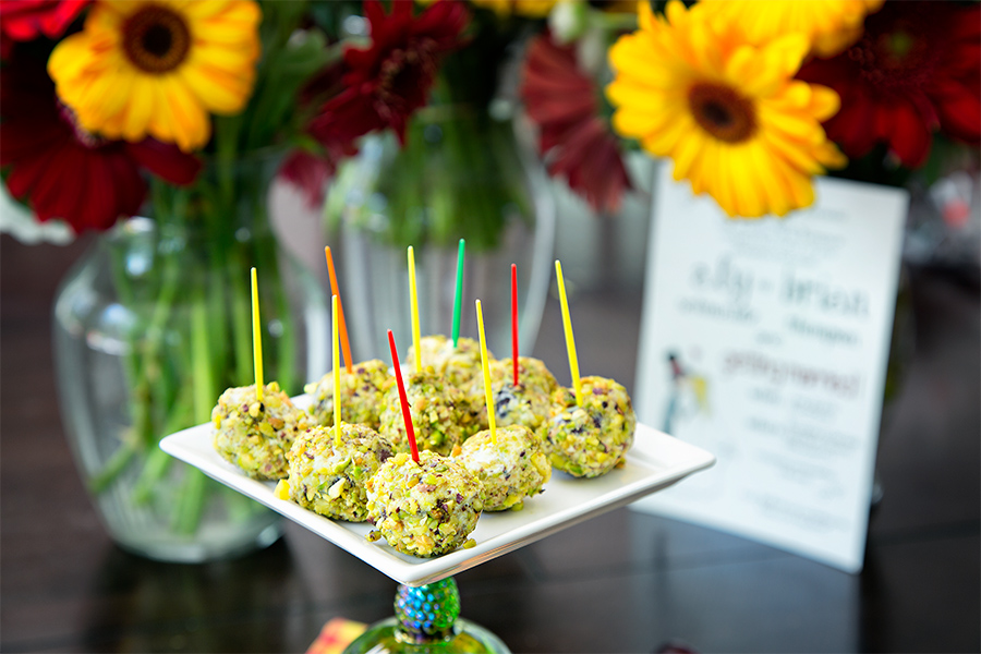 I am of the opinion that bright colors make everything look better, but these blue cheese wrapped grapes rolled in a spicy pistachio mixture goes particularly well with the bright colors that we used at my daughter’s wedding shower.  Her maid of honor brought roses, gerbera daisies and white flowers to decorate our home for the shower.  The bright green pistachios seemed perfect with this color scheme.