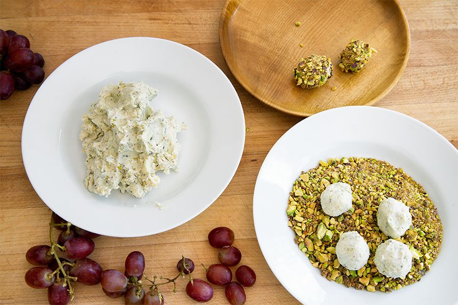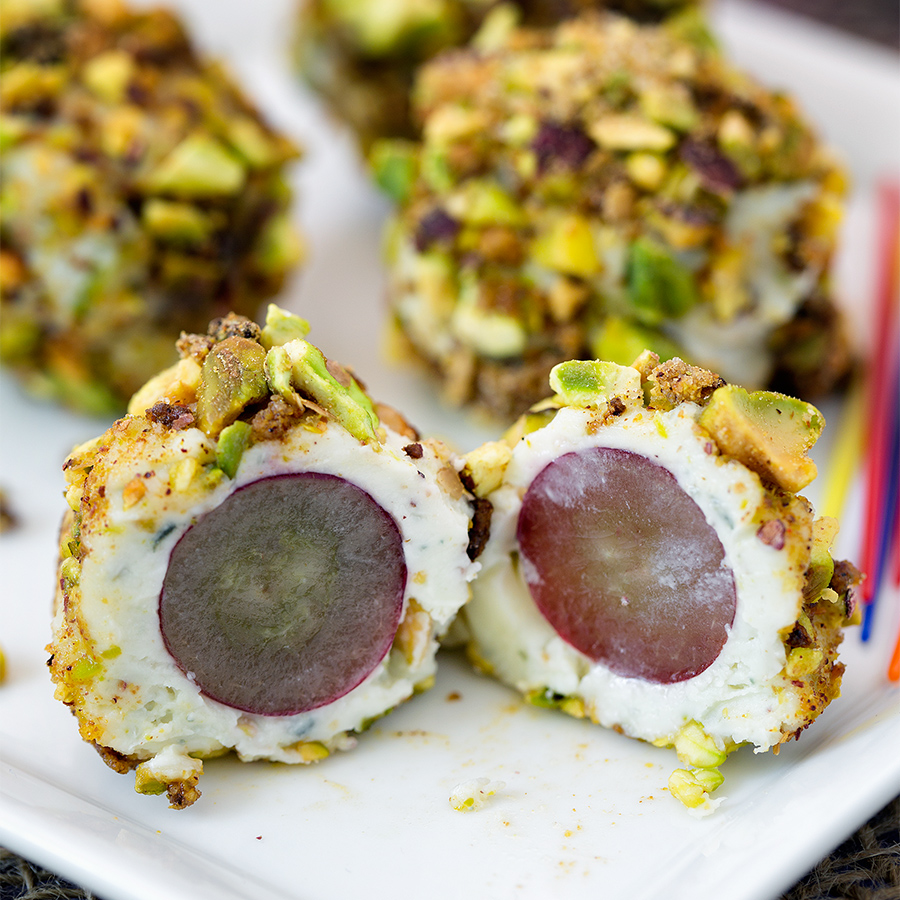 A mixture of cream cheese and blue cheese wraps around fresh, juicy grapes and then they are rolled in candied chipotle spiced chopped and toasted pistachios makes a crowd pleasing appetizer.