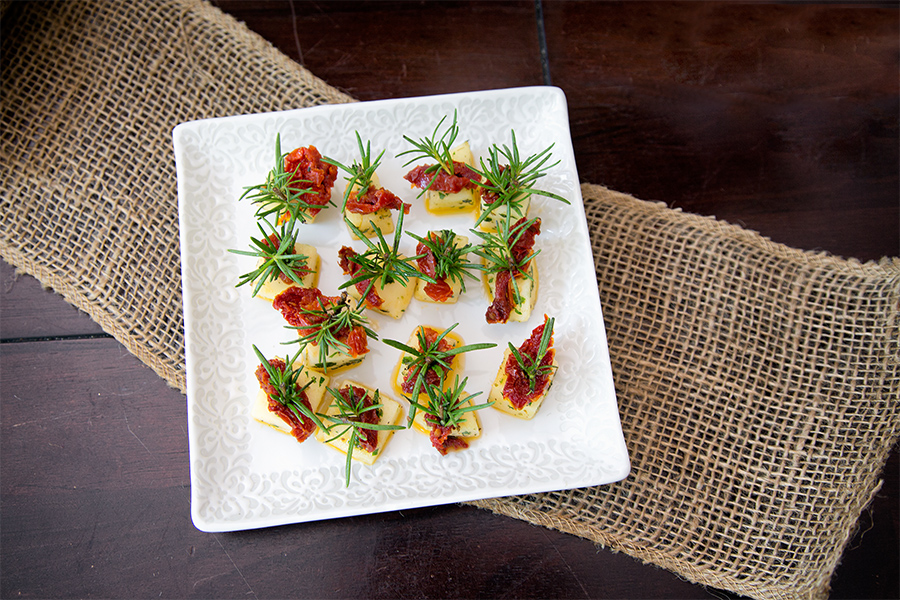 The Rosemary is used as a little toothpick while it imparts a pungent aroma and flavor to the cheese.