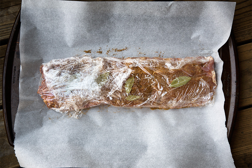 You just season the ribs with your favorite seasoning (Yes!Chef! used Galena Street Rib & Chicken Rib rub from Penzeys Spices and he also threw in a few Bay Leaves), wrap it all up tight in Plastic Wrap…yes, you heard me right…like the Saran Wrap that you might have wrapped around yourself years ago when you heard you could lose 10 pounds in 1 hour.  Yes, that plastic wrap.