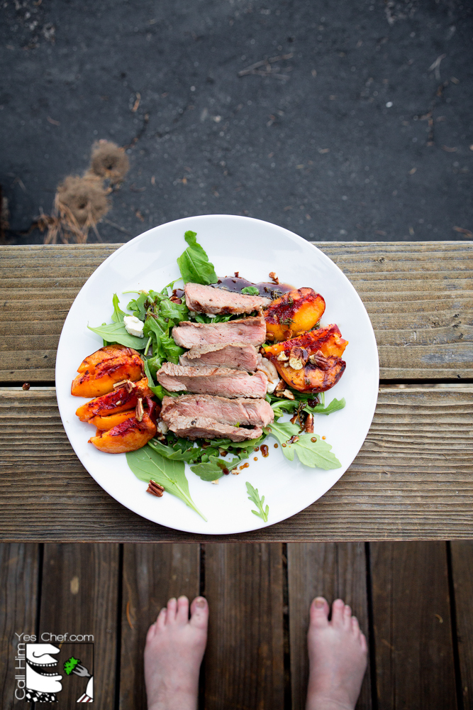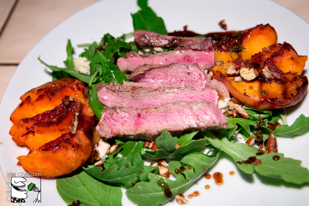 Grilled Ribeye and Grilled Peaches with arugula, blue cheese, thyme, pecans and honey balsamic dressing