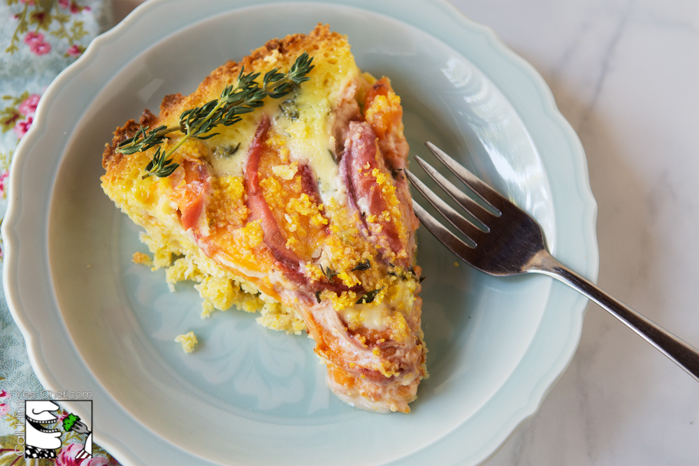 After you pour in the custard, you top the whole thing off with a crunchy polenta and sugar topping.
