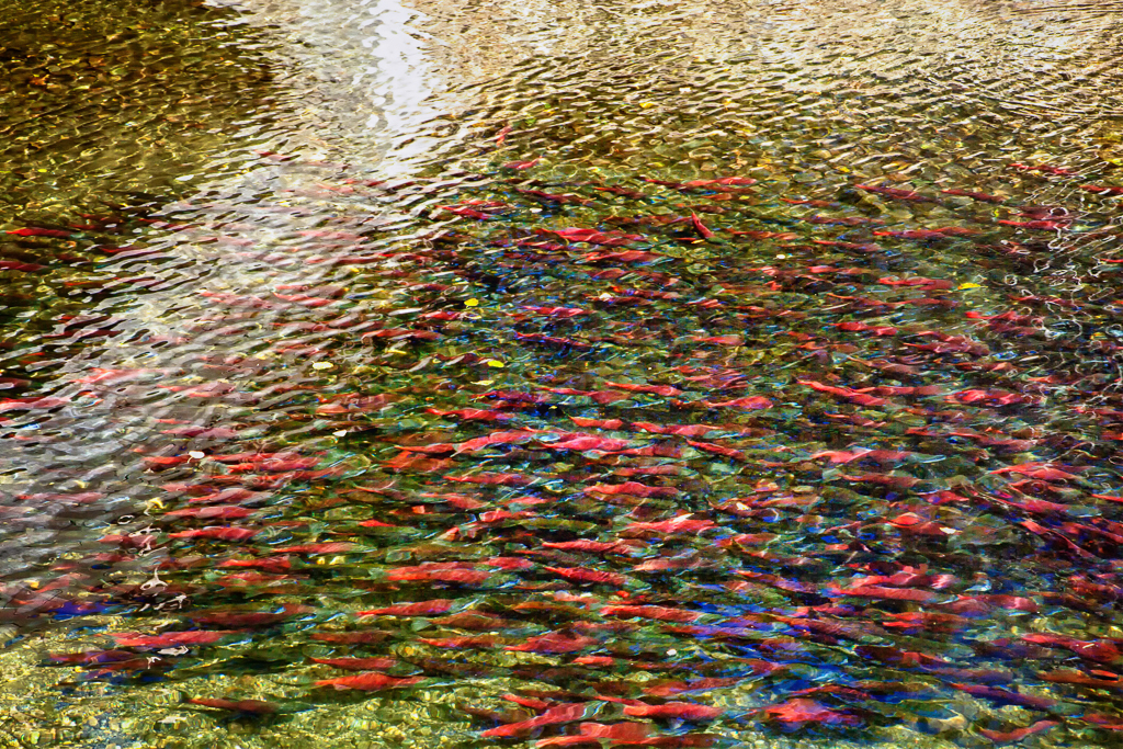 The colors are changing on more than just the leaves.  This time of year the Kokanee Salmon return to Taylor Creek to spawn and, sad to say, die.  In the process, they change from regular salmon fish color to bright orange.  The male fish snout also grows into a hook.  They are a beautiful sight to see.