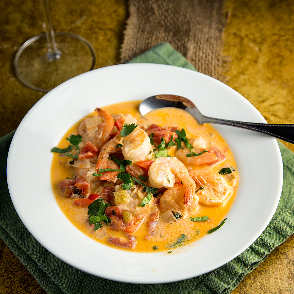 • Add the tomatoes, shrimp and cilantro to the Dutch Oven and simmer gently until the shrimp turns opaque.