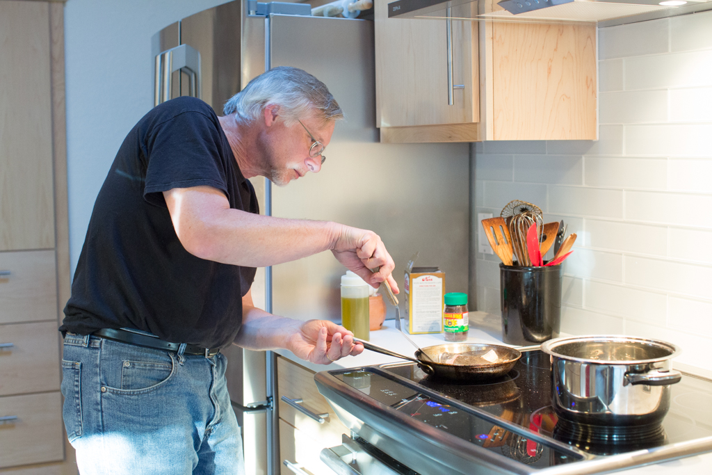 One of the necessary pieces of equipment that he neglected to bring was a large pan.  So, he had to make do with a too small pan.  (It was still tasty.)