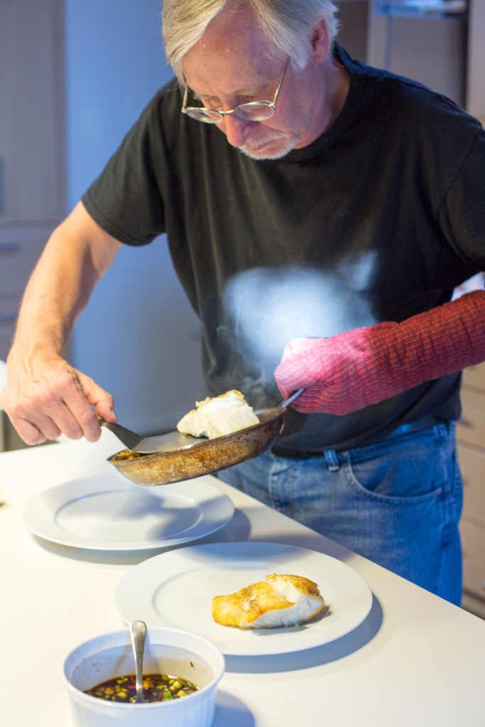 The evening was warm the other night when Yes!Chef! brought some fresh halibut to the new abode (which we are still not living in) because he wanted to try out the new range.  Yes, the new range is “working” again.  Over the weekend it continued on its path of beeping and flashing error codes at me, so I began pushing every button that I could.  It would stop beeping for a while and then start up again.  I tried to cook something (water) on the cooktop and it worked slick.  I also heated up both ovens and they worked.  I tried locking the panel down and that seemed to work to stop the incessant beeping.  Ever since that time, the range has been behaving itself.