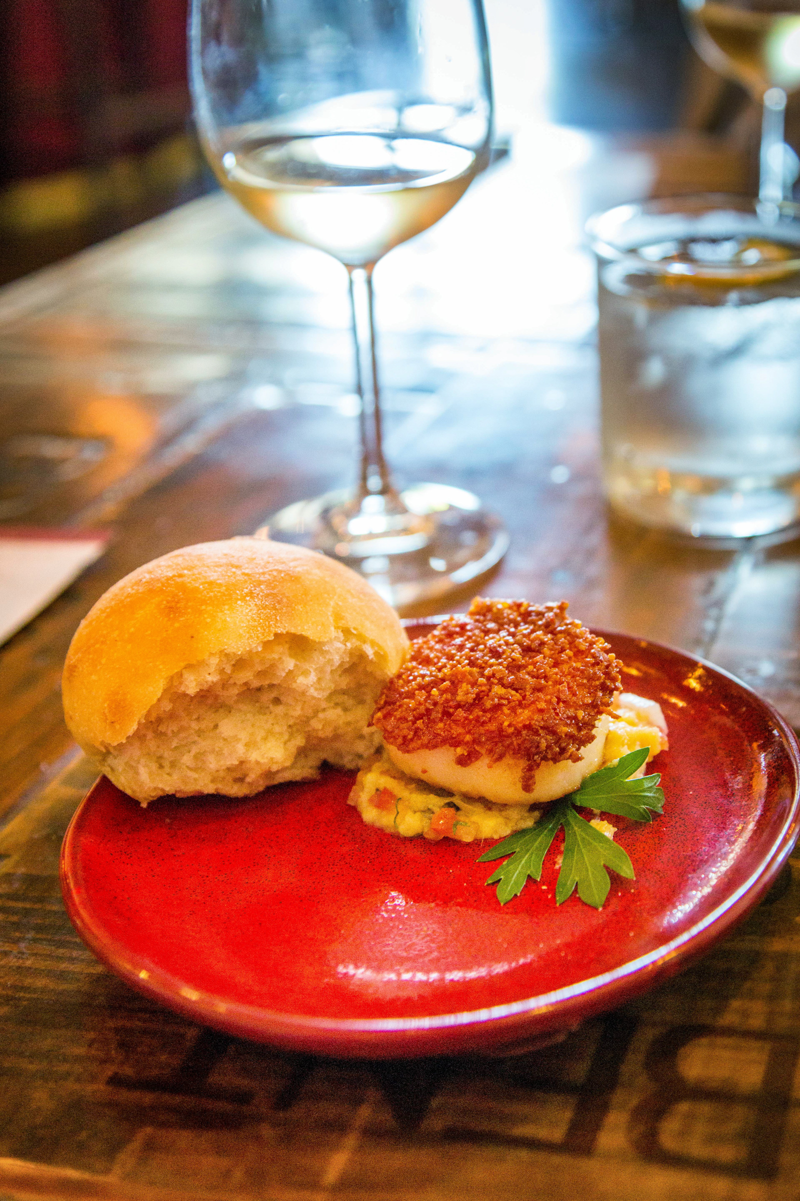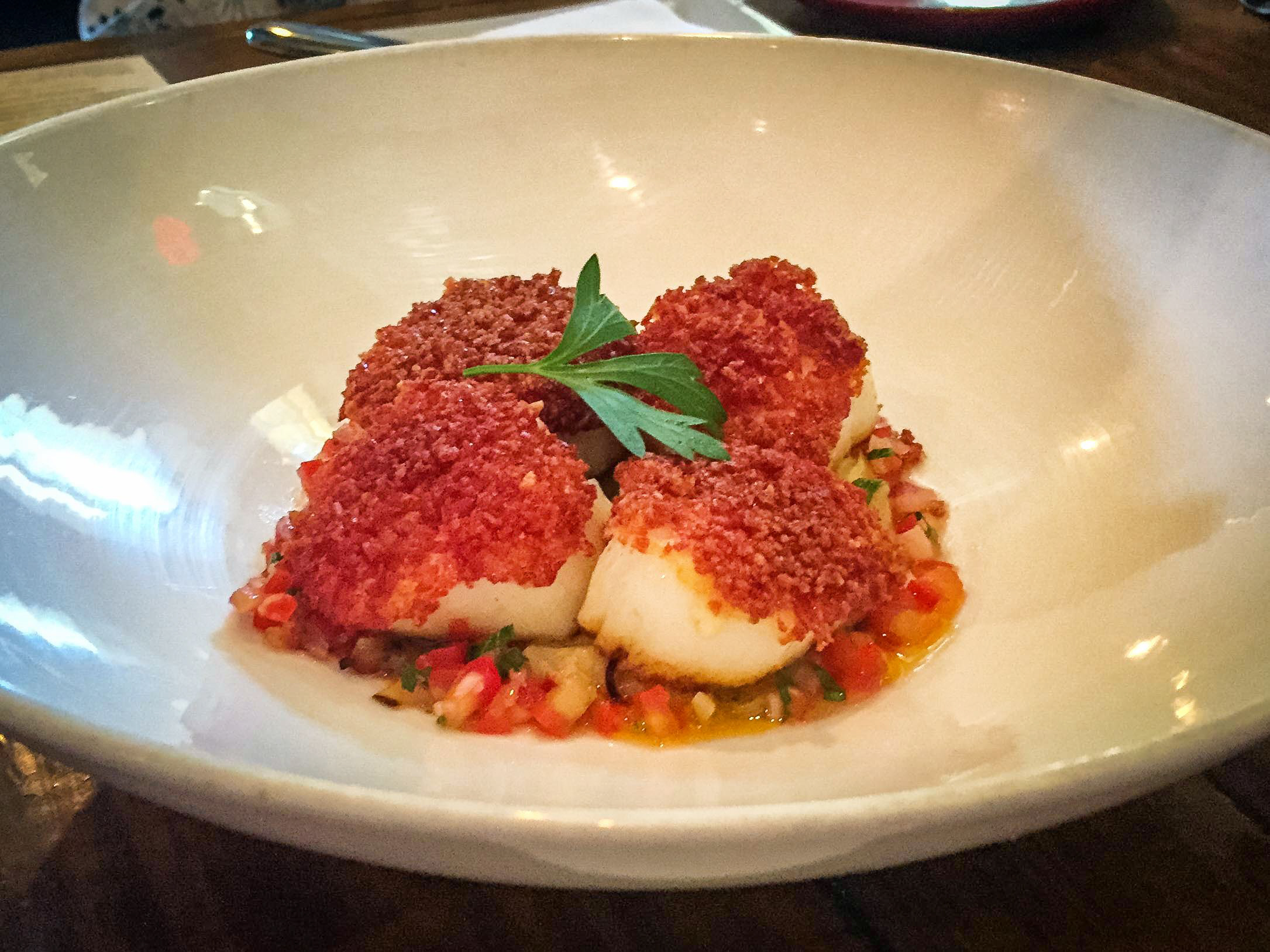 We tried some delicious Portuguese food and drink in this establishment after the server explained the history of the restaurant and some of the items on the menu. We had a refreshing drink and a mini entree of Chourico Crusted Scallops. They were pan seared and included a sweet potato puree and leek confit. So, so good.