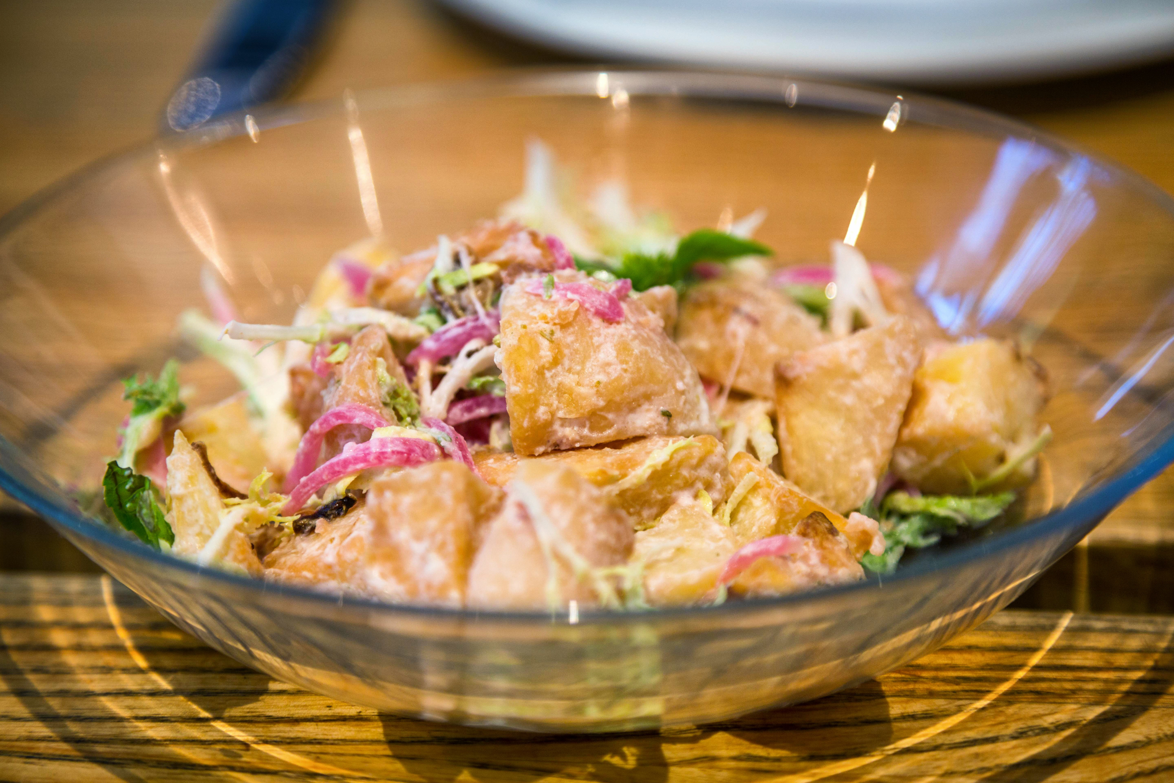 Patatas Bravas, which are fried potatoes with a dipping sauce.