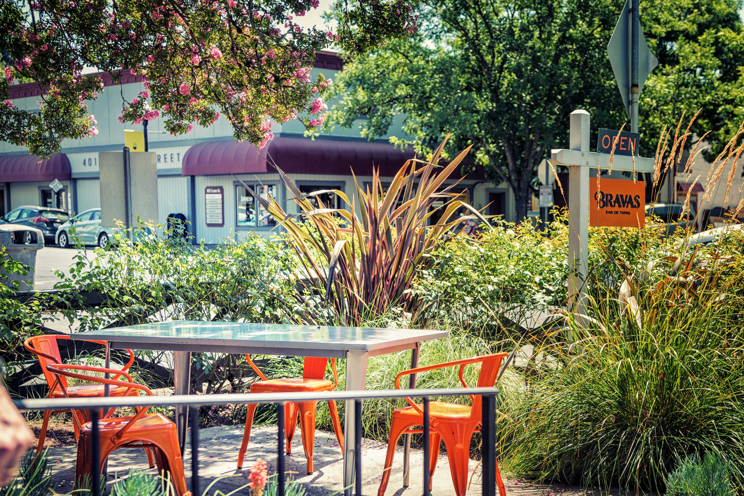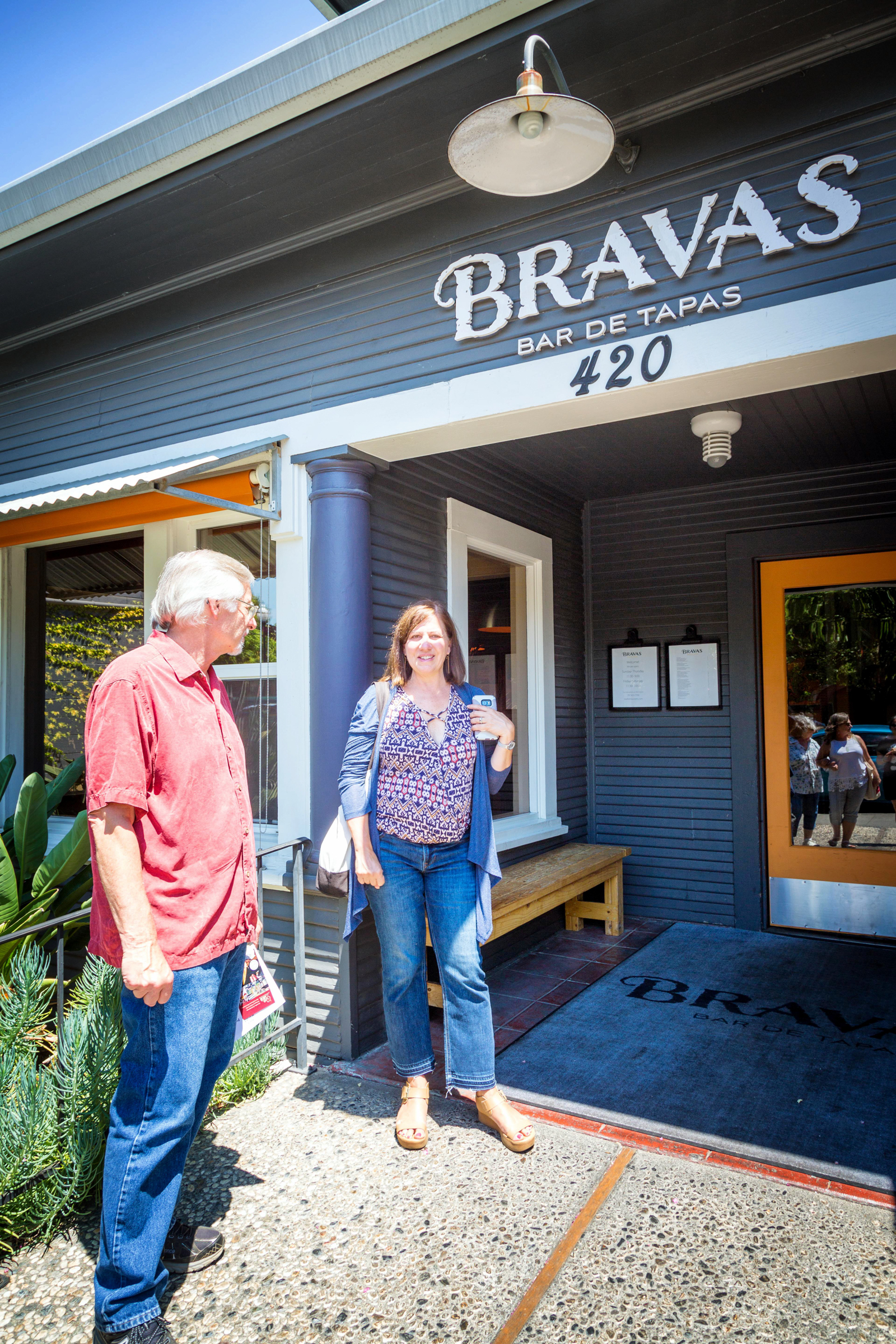 Our next stop was Bravas Restaurant, which specializes in Tapas. It is one of the most popular Restaurants in Healdsburg. It’s a charming little restaurant with indoor and outdoor seating. There are tables in the front of the building, tables on a beautiful patio in the back of the building (which also has a bar), and tables on the porch, which was where our group was seated. On Fridays they serve Paella made outside on their huge Paella pan.