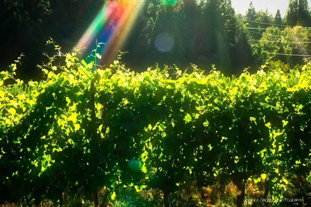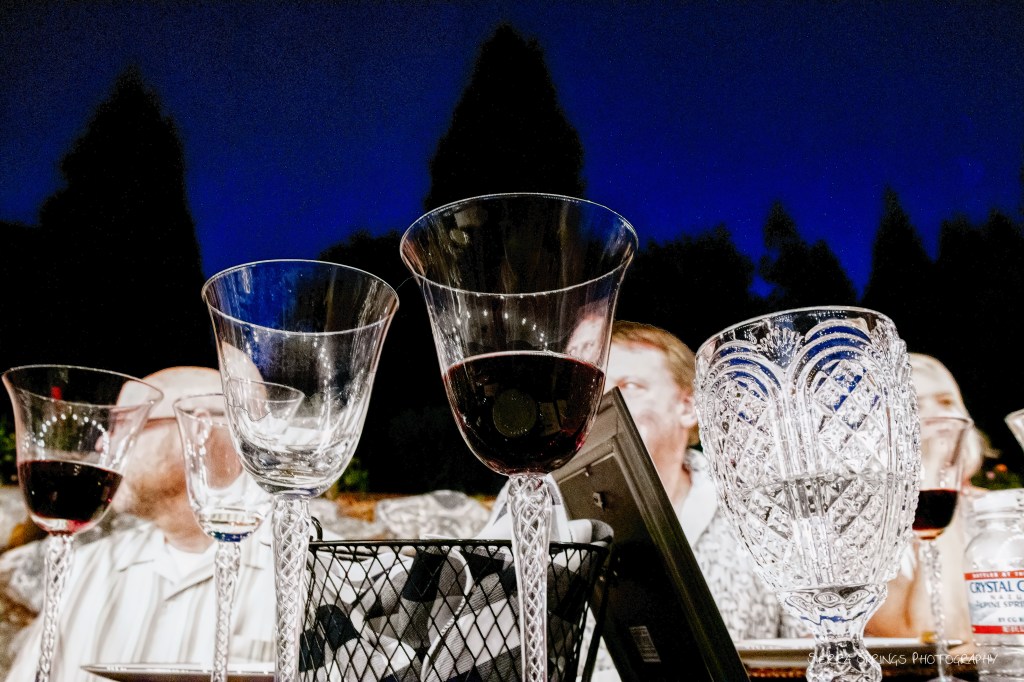 Around 7:30, we made our way down the hill to the long tables with huge umbrellas to shield us from the hot summer sun. We walked thru the vineyards where the grapes were becoming ripe and lush. At the bbottom of the hill they had set up a huge double door, painted white, with a large fork, knife and spoon adorning the header above the door. A big milk can full of sunflowers sat next to the doors. When we walked thru the doors, the tables were long and set beautifully. There were strings of lights hung from an off-center pole. Live music played softly in the background.
